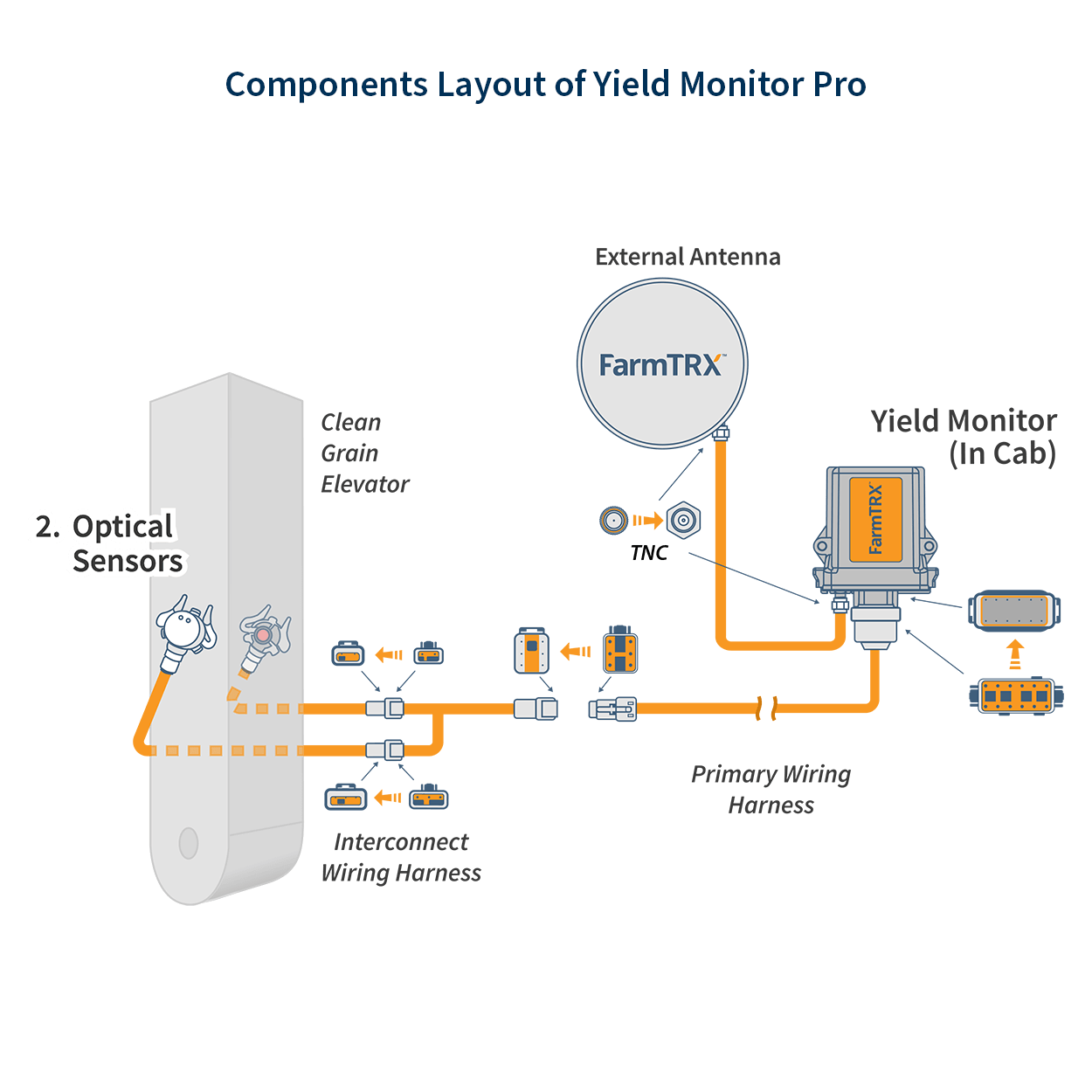 Two right-angle optical sensors (transmitter & receiver) install on either side of the clean grain elevator measuring grain volume on the passing paddles and wired to the Yield Monitor ECU in-cab.